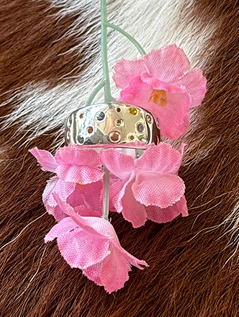 Add a splash of color to your style with this playful sterling silver band ring, sparkling with multi-colored sapphire stones. Its vibrant hues bring a joyful twist to any outfit, making it the perfect accessory to brighten your day. Durable and dazzling, this ring is a fun way to express your unique sparkle!