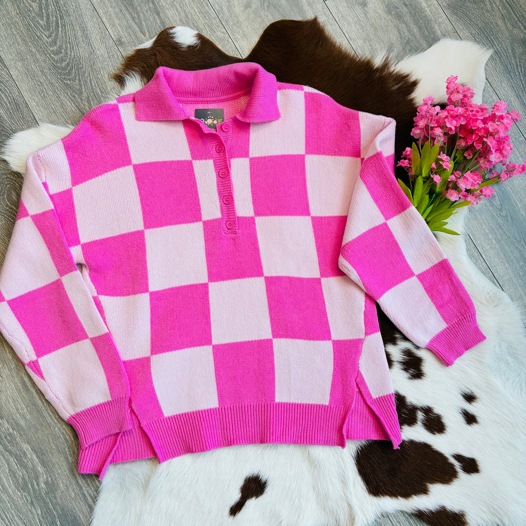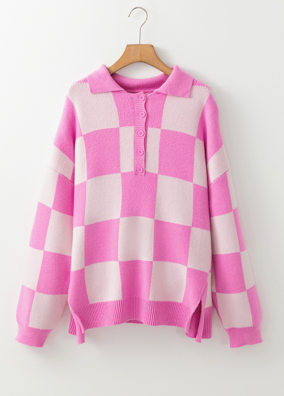 Meet the sweater that feels like a sunny picnic and a cute outfit had a baby. The Strawberry Picnic Polo Sweater features soft blush and hot pink gingham in a cozy knit with a classic polo neckline that adds just the right touch of sporty charm.